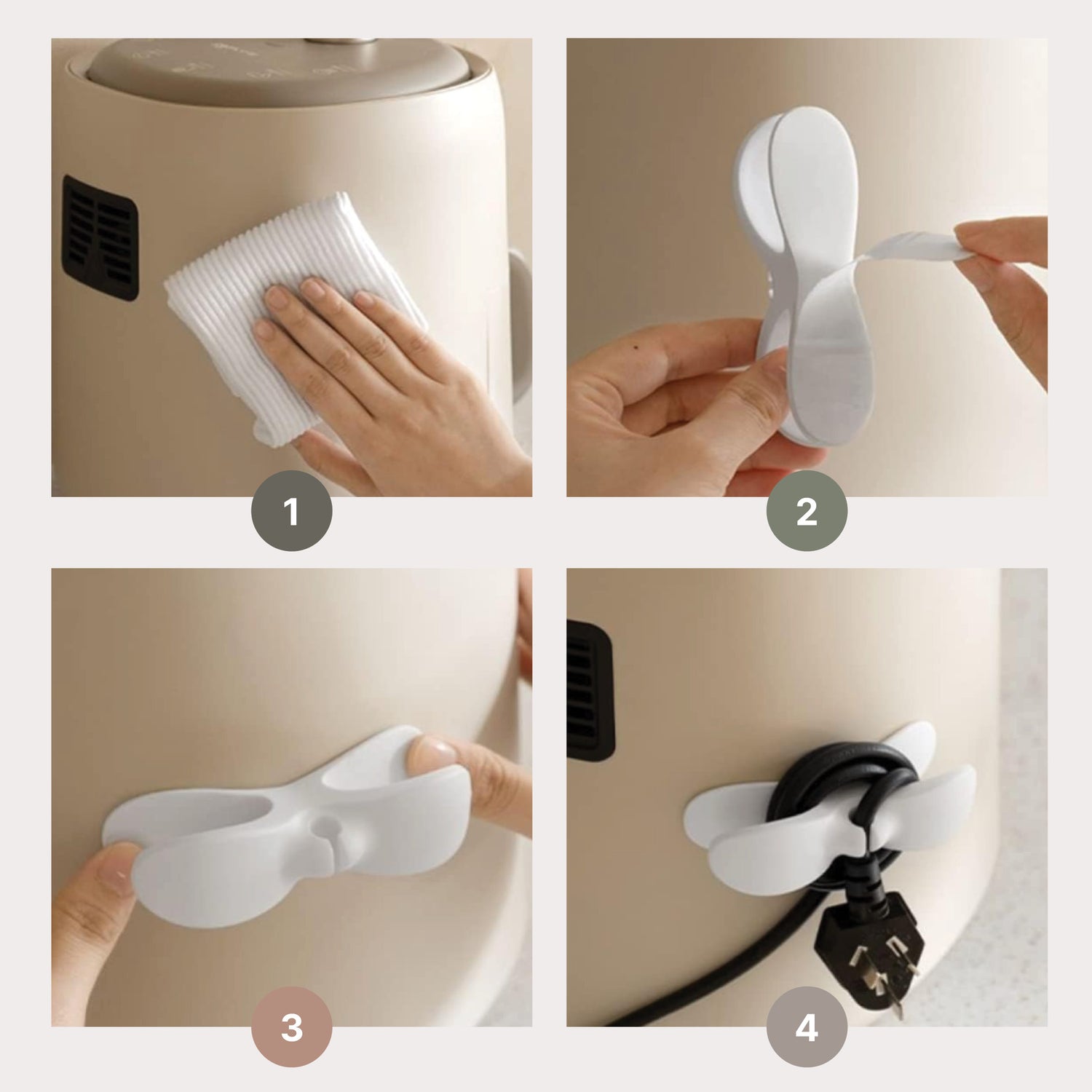 - Peel off the 3M adhesive and stick the appliance cable winder